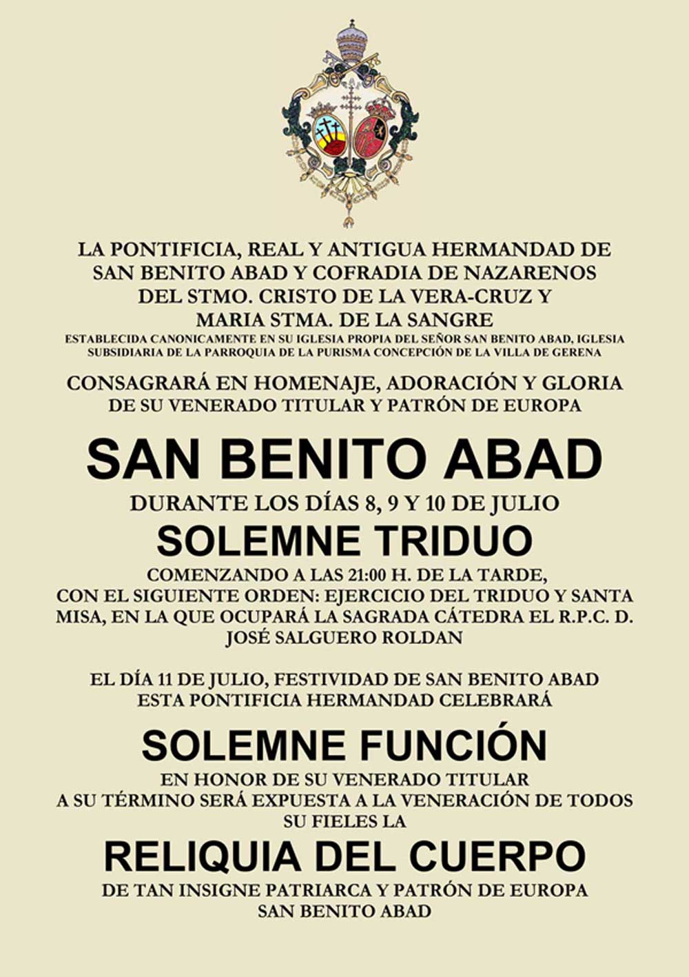 04/07/2011 SOLEMNE TRIDUO EN HONOR DE SAN BENITO ABAD La Hermandad celebrará en paralelo a los cultos la tradicional velá de San Benito en el patio de la capilla. |