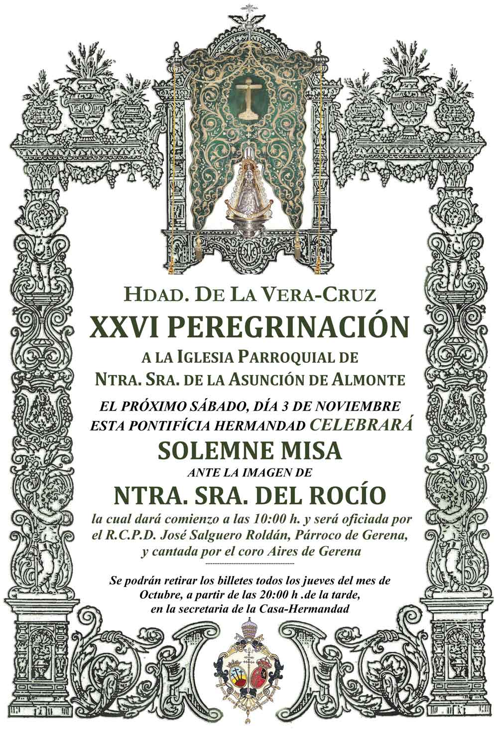 La Hermandad realizará el próximo día 3 de noviembre la XXVI peregrinación ante la Virgen del Rocío, que este año será hasta la Parroquia de Ntra. Sra. de la Asunción de la localidad de Almonte.
